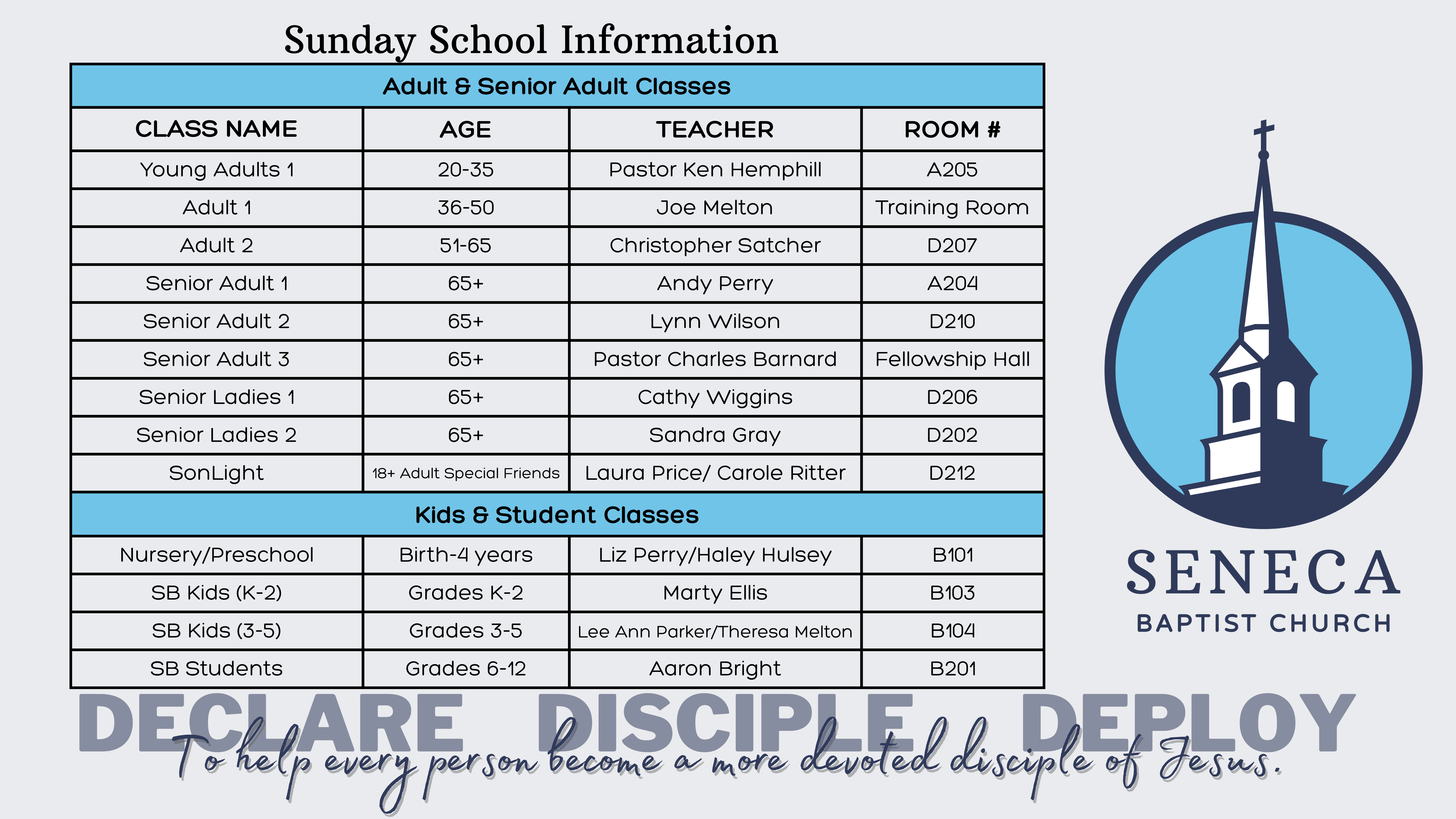 Seneca Baptist Sunday School is a vital part of Seneca Baptist Church. We are focused on becoming a Great Commission Sunday School and plan to accomplish this goal by Reaching, Teaching, and Ministering to church members and guests. We invite you to get involved in a small group on Sunday mornings at 9:00. Sunday School is an excellent way to get plugged in at Seneca Baptist Church, get to know other church members, and be ministered to.